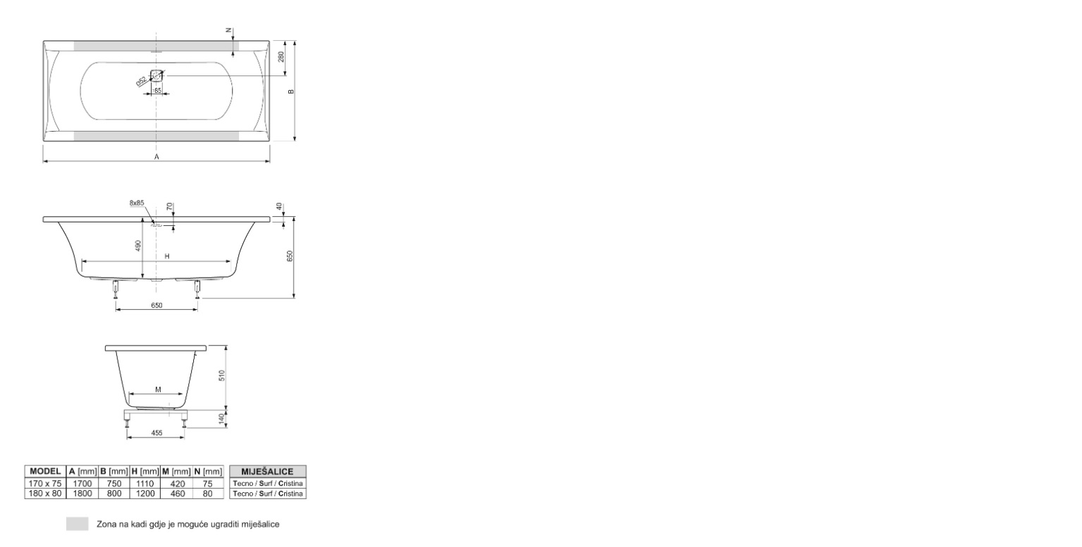 Colorado je elegantna i moderna pravokutna kada, a dostupna je u varijanti za obzidavanje i u varijanti s ugrađenim postoljem i oblogom. U varijanti za obzidavanje isporučuje se s nogicama i ugrađenom preljevno-otočnom garniturom sa slot sifonom i kvadratnim klik-klak ventilom sifona.