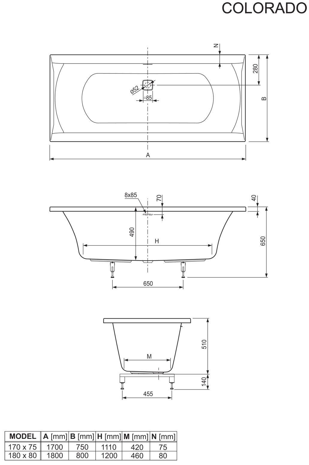 Colorado je elegantna i moderna pravokutna kada, a dostupna je u varijanti za obzidavanje i u varijanti s ugrađenim postoljem i oblogom. U varijanti za obzidavanje isporučuje se s nogicama i ugrađenom preljevno-otočnom garniturom sa slot sifonom i kvadratnim klik-klak ventilom sifona. U varijanti s oblogom isporučuje se s ugrađenim postoljem, oblogom i ugrađenom preljevno-otočnom garniturom sa slot sifonom i kvadratnim klik-klak ventilom sifona.