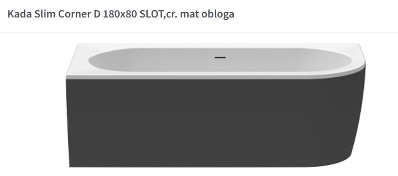 Elegantna kada Slim Corner s oblogom u crnoj mat izvedbi namijenjena je za ugradnju u kut i karakteristična je po elegantnom ovalnom obliku i slot preljevu. Isporučuje se s tvornički montiranom i fiksiranom oblogom, preljevno-otočnom garniturom s klik-klak ventilom i gibljivim crijevom za spoj na odvod. Kod montaže dovoljno je spojiti gibljivo crijevo na odvod, učvrstiti kadu na zid, utočiti vodu i kada je spremna za kupanje!