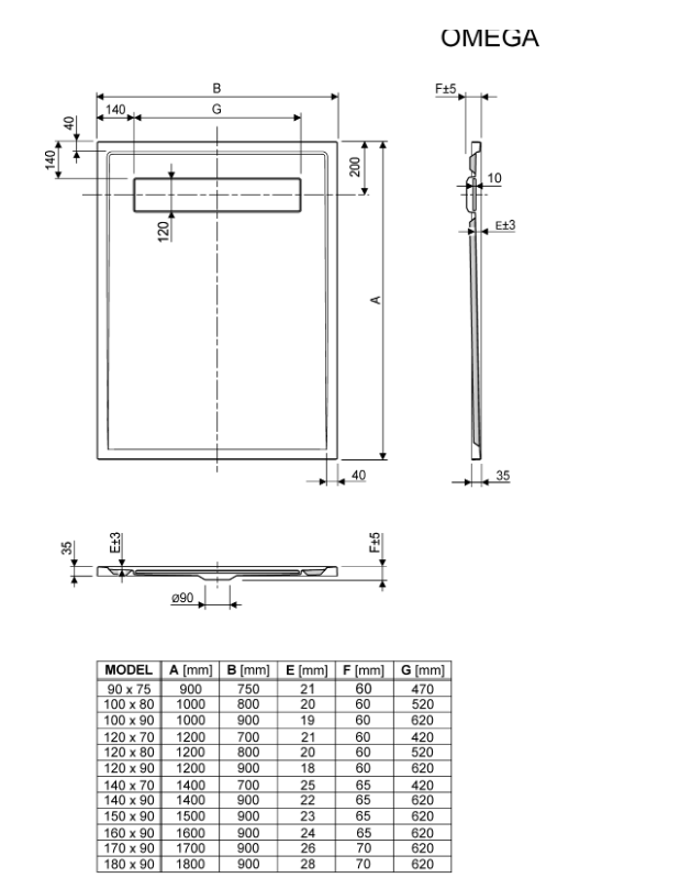 Omega je vrlo plitka tuš kada namijenjena ugradnji u razinu poda. Elegantna i inovativna izvedba izljeva pomoću akrilne pedane čini ju iznimno atraktivnom.