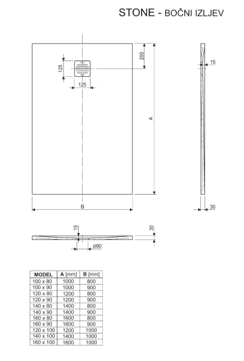 Poziciju sifona za svaku od dimenzija pravokutnih tuš kada Stone provjerite na nacrtima u poglavlju “tehničke informacije”.