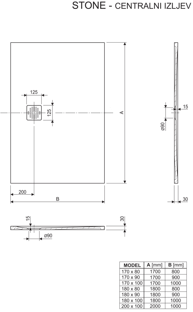 Tuš kade s reljefnom površinom Stone izrađene su od lijevanog mramora koji im daje maksimalnu čvrstoću i otpornost. Ove tuš kade dostupne su u nekoliko standardnih dimenzija i tri različite boje: bijela, crna i cement. Posebna prednost tuš kada Stone je mogućnost rezanja do određenih gabarita radi prilagodbe specifičnoj konfiguraciji prostora za tuširanje. Rezanje tuš kade možete izvesti samostalno prema uputi ili naručiti tvorničko rezanje uz obavezno predočenje nacrta.