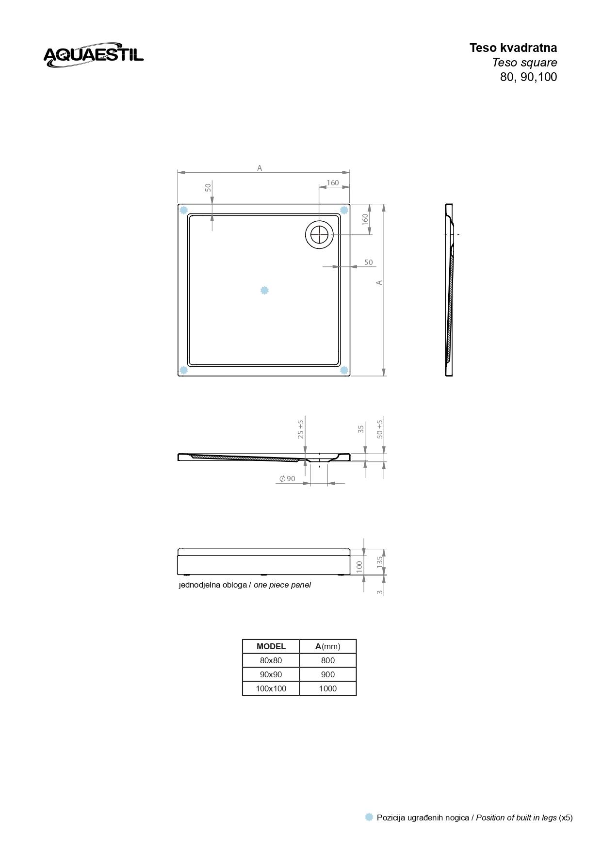 Teso je plitka tuš kada prvenstveno namijenjena ugradnji u razinu poda, ali je dostupna i u verziji s oblogom. Kvadratna verzija ove tuš kade dostupna je u nekoliko standardnih dimenzija.