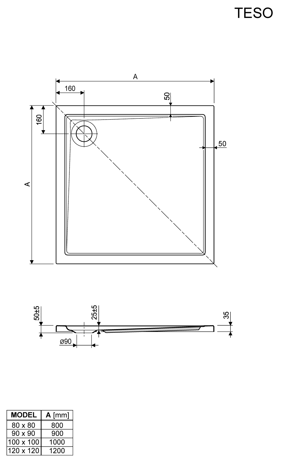 Teso je plitka tuš kada prvenstveno namijenjena ugradnji u razinu poda, ali je dostupna i u verziji s oblogom. Kvadratna verzija ove tuš kade dostupna je u nekoliko standardnih dimenzija.