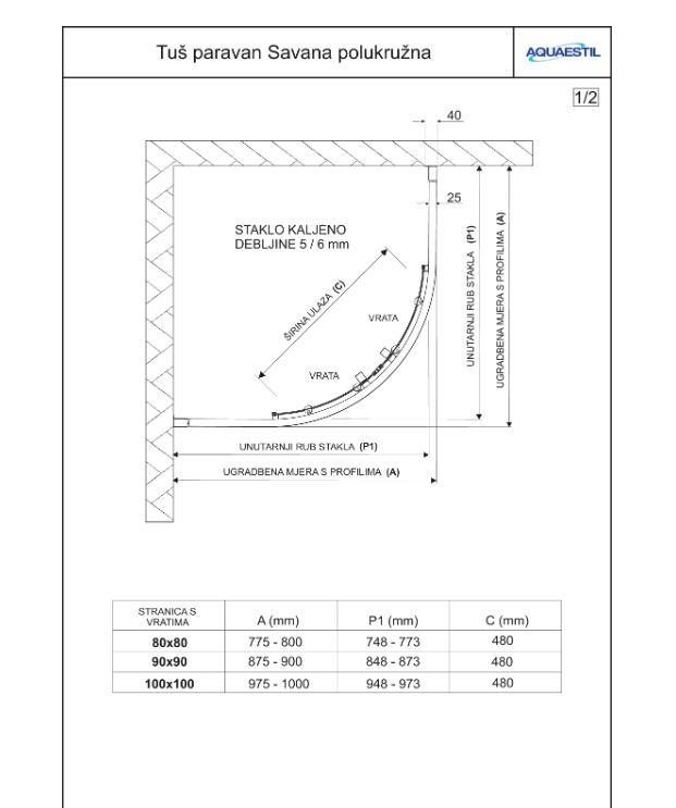 Aquaestil Tuš paravan Savana 90 polukružna, silver/prozirna