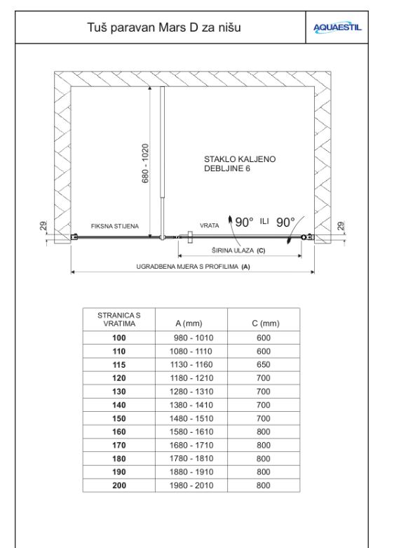 Mars D za nišu je kvalitetan paravan koji je namijenjen ugradnji između 3 zida (u nišu), a sastoji se od jedne fiksne stijene i okretnih vrata. Paravan je opremljen elegantnim, u presjeku okruglim profilima i 6 mm kaljenim staklom koje je tvornički tretirano nano-nanosom protiv kamenca. Kod naručivanja paravana s reljefnim staklom, potrebno je definirati smjer otvaranja vrata (L ili D). Prilikom montaže paravana moguće je podesiti smjer otvaranja vrata (prema unutra ili prema van).