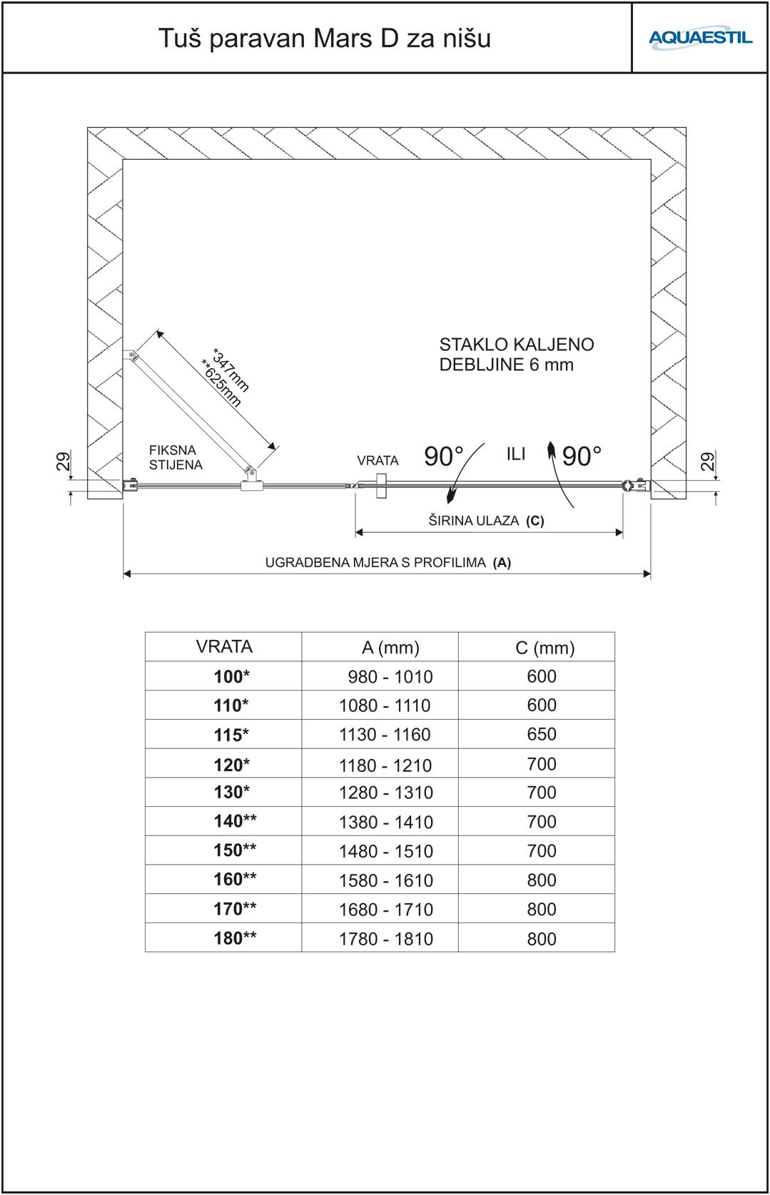 Mars D za nišu je kvalitetan paravan koji je namijenjen ugradnji između 3 zida (u nišu), a sastoji se od jedne fiksne stijene i okretnih vrata. Paravan je opremljen elegantnim, u presjeku okruglim profilima i 6 mm kaljenim staklom koje je tvornički tretirano nano-nanosom protiv kamenca. Kod naručivanja paravana s reljefnim staklom, potrebno je definirati smjer otvaranja vrata (L ili D). Prilikom montaže paravana moguće je podesiti smjer otvaranja vrata (prema unutra ili prema van).