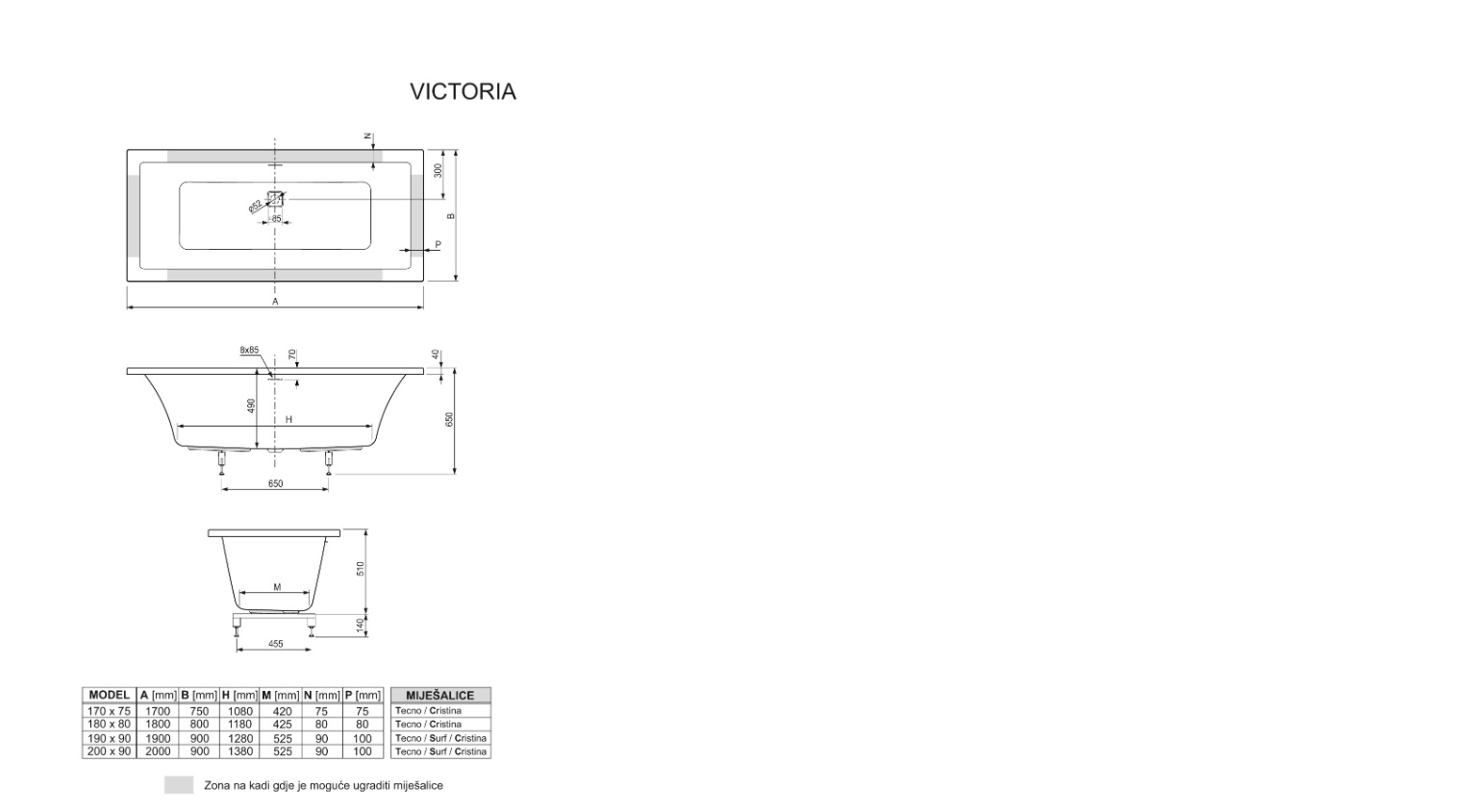 Victoria je elegantna i moderna pravokutna kada, a dostupna je u varijanti za obzidavanje i u varijanti s ugrađenim postoljem i oblogom. U varijanti za obzidavanje isporučuje se s nogicama i ugrađenom preljevno-otočnom garniturom sa slot sifonom i kvadratnim klik-klak ventilom sifona. U varijanti s oblogom isporučuje se s ugrađenim postoljem, oblogom i ugrađenom preljevno-otočnom garniturom sa slot sifonom i kvadratnim klik-klak ventilom sifona.