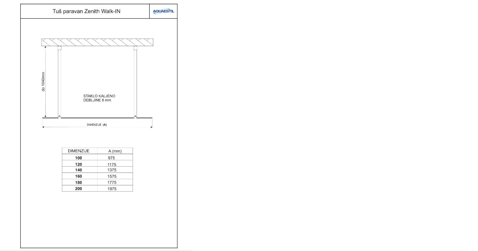 Zenith je moderna fiksna staklena stijena koja se postavlja paralelno sa zidom na koji je naslonjena tuš kada ili prostor za tuširanje izveden od keramičkih pločica, a u kombinaciji s jednom od plitkih Aquaestil tuš kada ili prostorom izvedenim od pločica, sačinjava moderni “walk-in” kupaonski koncept. Brtvljenje na spoju tuš kade/pločica i fiksne stijene osigurava se aluminijskim U profilom.