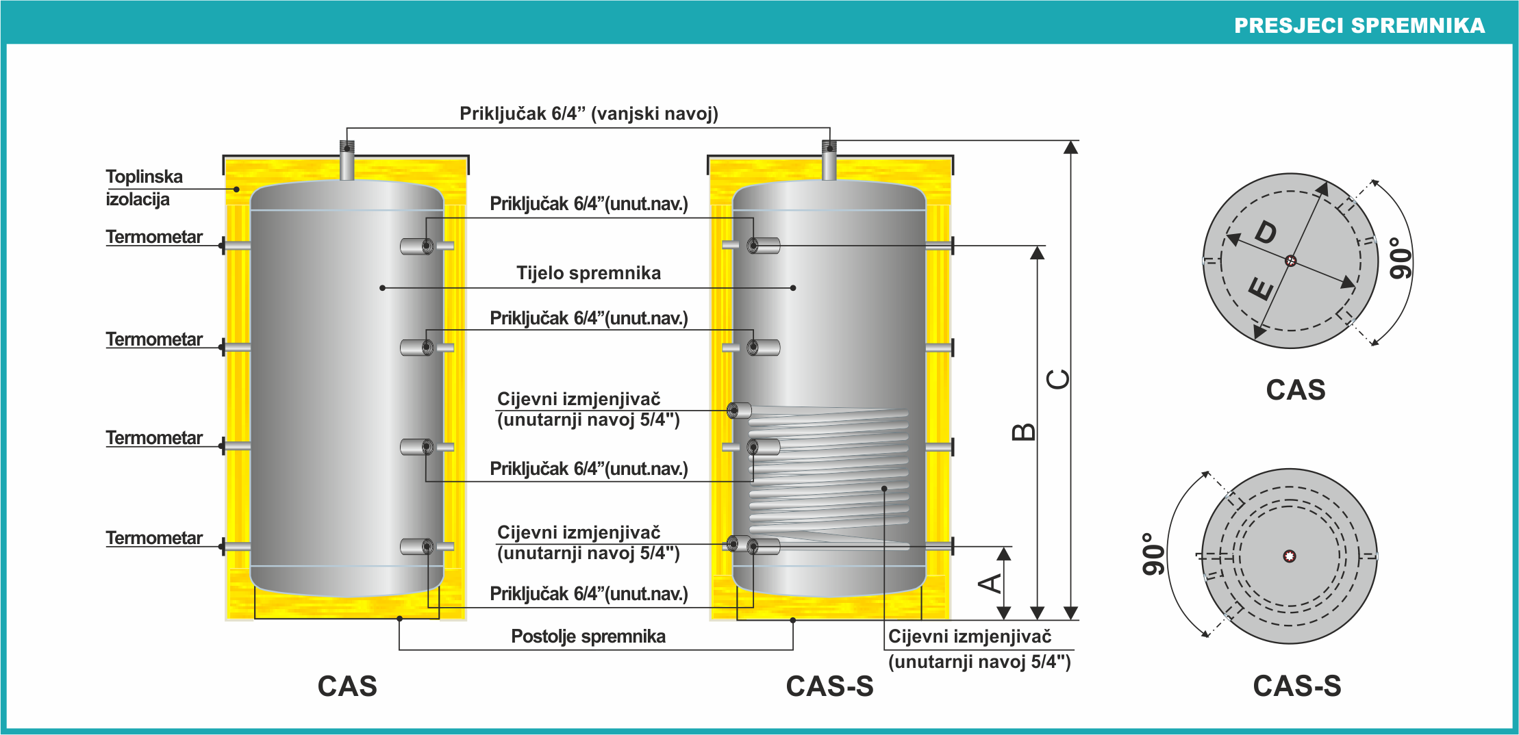 CAS-BS – akumulacijski spremnik sa ugrađenim inox spremnikom za potrošnu toplu vodu i cijevnim izmjenjivačem za solarne kolektore