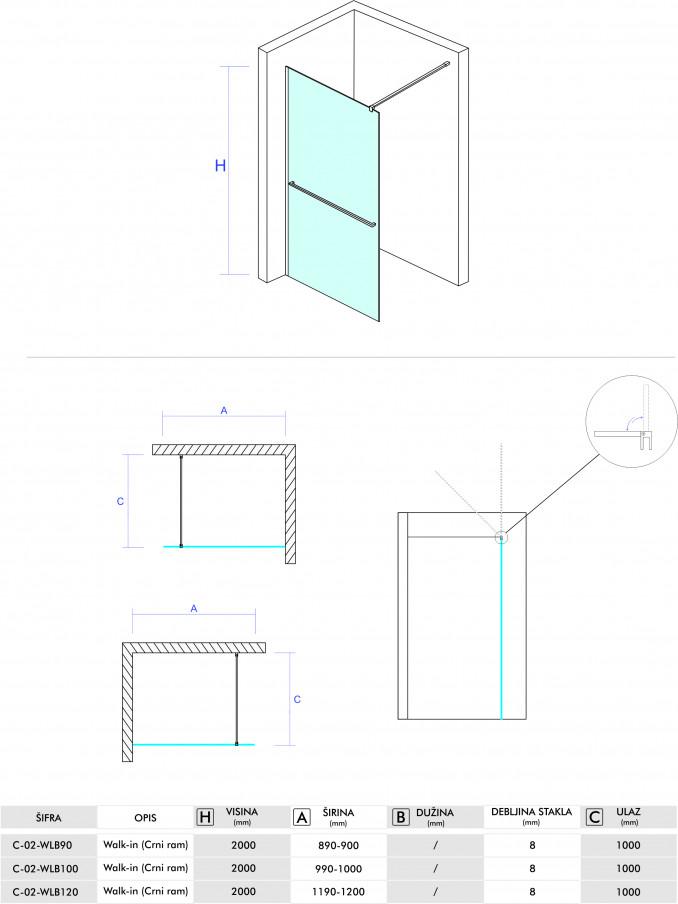 CONCEPT MONTE PLUS Stakleni paravan 1000×2000 crni mat okvir 8mm staklo+držač ručnika