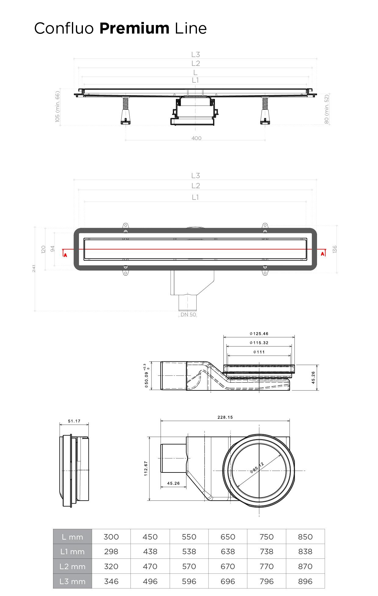 – minimalna visina sifona 52mm, visina rešetke 23mm