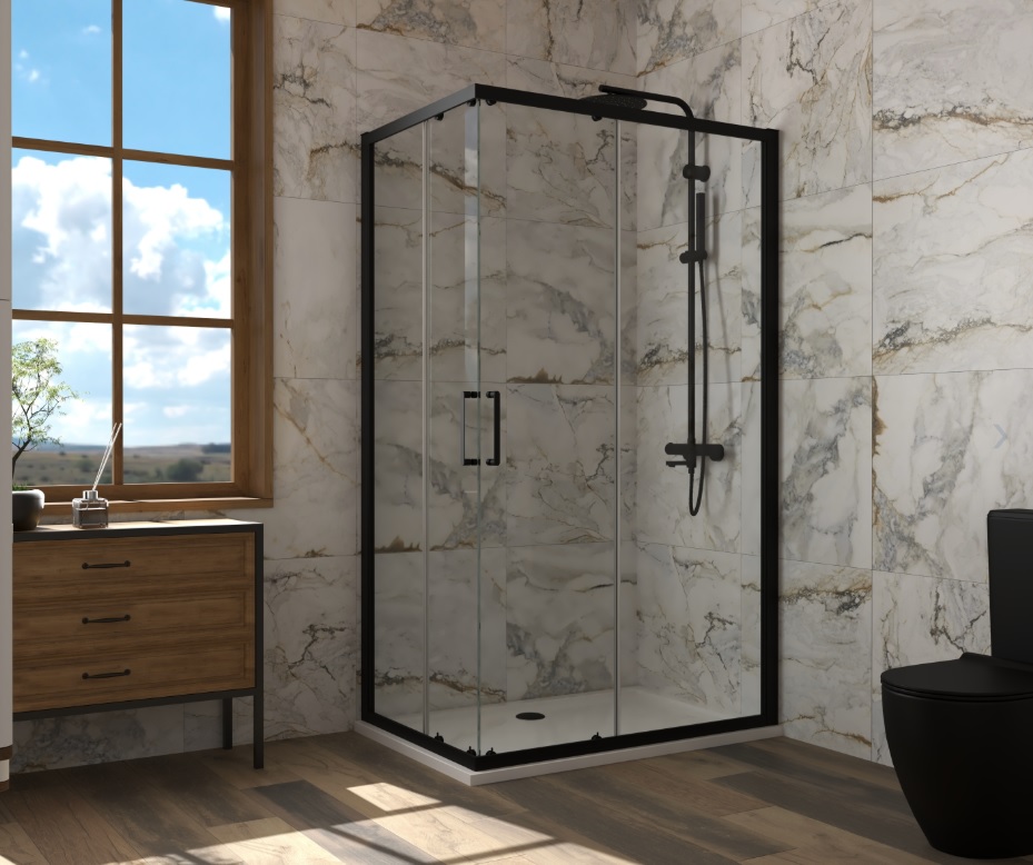 Elegantna estetika – Prozirno staklo i crni okvir daju moderan i luksuzan izgled kupaonici.
