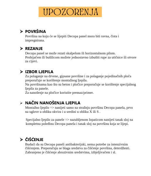 Lijepljenje panela na postojeće pločice značajno skraćuje vrijeme renoviranja. PVC zidni paneli iznimno su čvrsti i fleksibilni, vodootporni i dostupni u širokom rasponu dizajna visokog sjaja. Veličina panela je 122 x 260 cm, debljina 2,8 mm, a težina jednog panela 15 kg.
