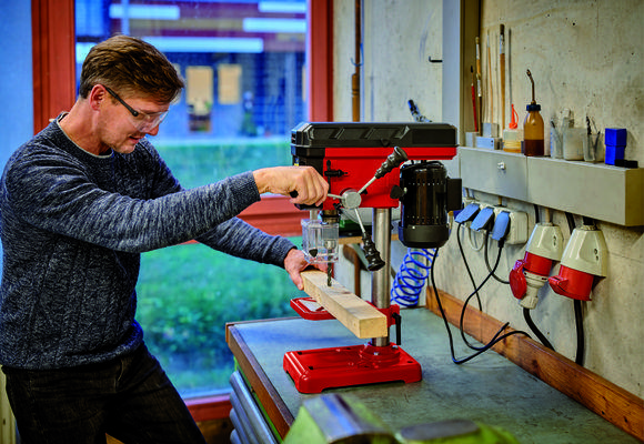 Einhell stupna bušilica TC-BD 450 je precizan alat za posebne zahtjeve: Stupna bušilica omogućuje bušenje rupa u drvu ili metalu s vrhunskom preciznošću. Snaga od 450 W i 5 postavki brzine za sve materijale osnova su za poslove preciznog bušenja. Za brze i točne rezultate postoji podesivi graničnik dubine. Maksimalna dubina bušenja je 50 mm. Ova stupna bušilica ima robusnu steznu glavu s prstenastim prijenosom koja može primiti najčešće veličine svrdla. Osovina bušilice s kugličnim ležajevima omogućuje dugotrajnu i jednostavnu uporabu. Radi varijabilnosti ova stupna bušilica dolazi s beskonačno podesivim stolom za bušenje. Također je moguće rotirati i naginjati stol za bušenje. Dobrodošla značajka za preciznu primjenu pritiska je gumirana 3-kraka ručka. Radi sigurnosti tijekom korištenja postoji sklopivi štitnik od strugotine, a prekidač za uklj./isklj. s funkcijom otpuštanja nultog napona spriječava ponovno nenamjerno pokretanje stroja nakon nestanka struje.
