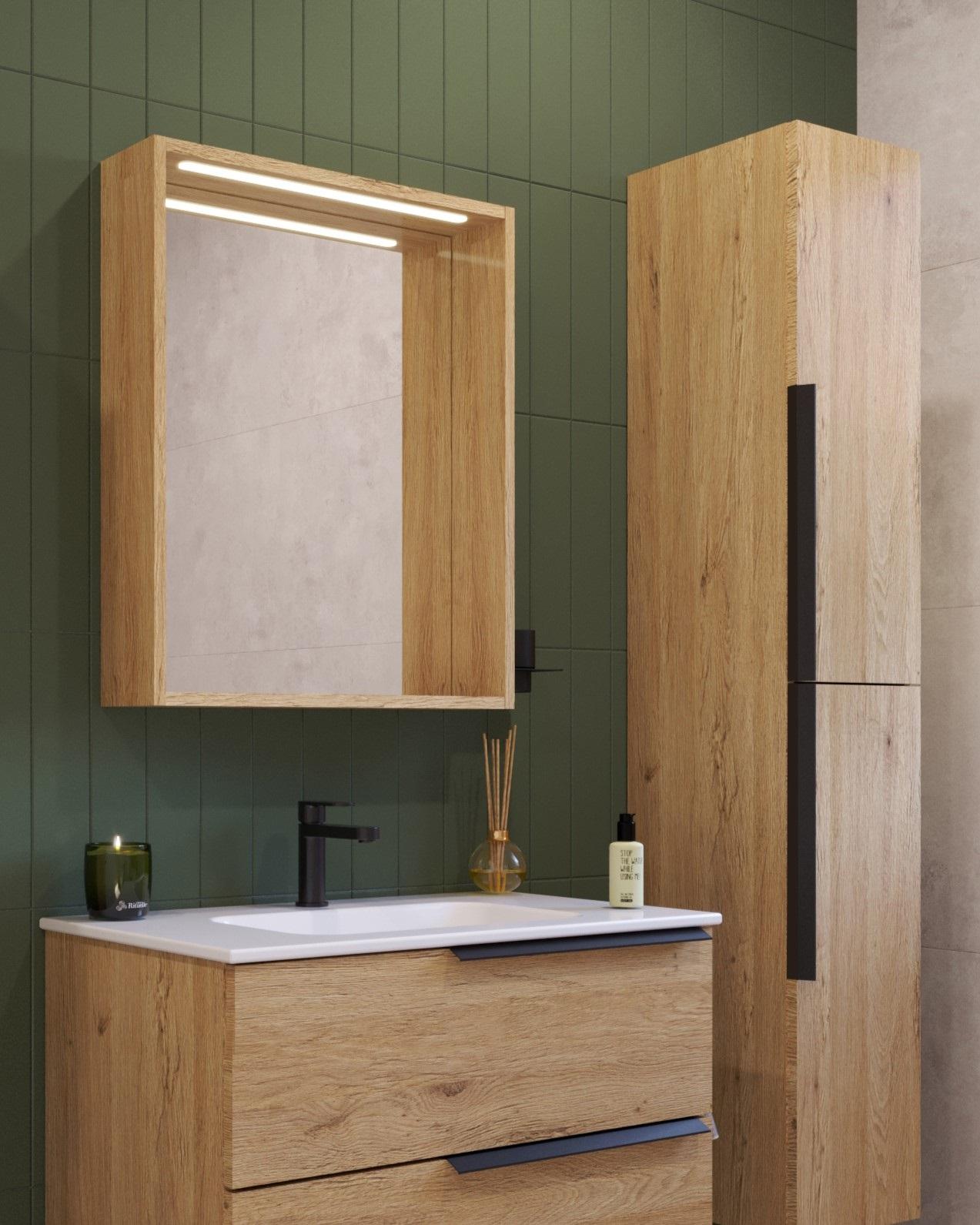 LATERAL ogledalo s LED svjetiljkom, prekidačem, držačem za čašu i čašom za četkice za zube savršen je spoj stila i funkcionalnosti za svaku kupaonicu. LED svjetiljka pruža idealno osvjetljenje koje stvara ugodnu atmosferu, a integrirani prekidač omogućuje jednostavno upravljanje rasvjetom. Elegantni držač za čašu te čaša za četkice za zube nude praktičan način za njihovo odlaganje. Hrast natural dekor unosi prirodnu toplinu i sofisticiranost, čineći vašu kupaonicu modernom, organiziranom i funkcionalnom.