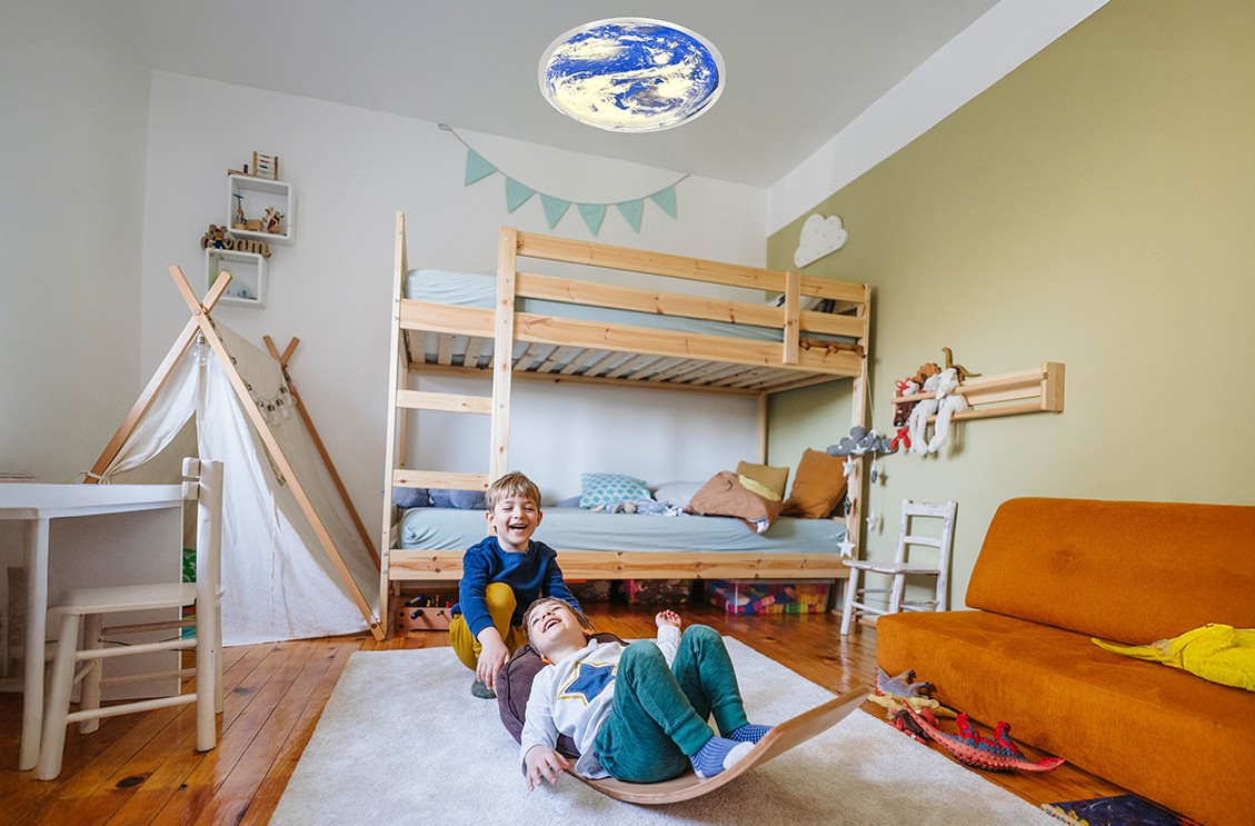 LED plafonjera EARTH donosi originalan vizualni dojam inspiriran prikazom Zemlje. Prilagodljivo svjetlo (3000K–6500K) i snaga od 24 W (1440 lm) omogućuju različite ugođaje u prostoru. Kombinacija bijele i plave boje čini je atraktivnim odabirom za dječje sobe, kreativne prostore, učionice ili domove koji traže detalj s karakterom.