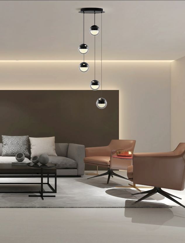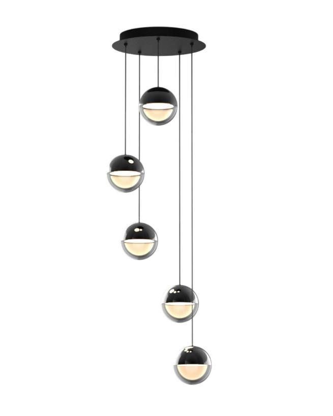LUMINIS 5 oblikuje prostor izraženijom svjetlosnom prisutnošću. Pet svjetlosnih površina u crno-kromiranoj izvedbi pruža slojevito i toplo osvjetljenje (3000K), stvarajući vizualni ritam koji se proteže kroz prostor. Idealno za definiranje većih zona unutar interijera ili kao dominantan rasvjetni element.