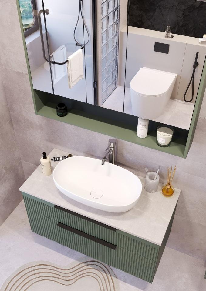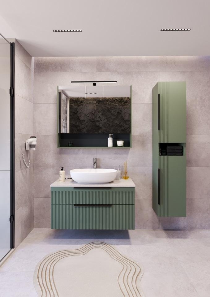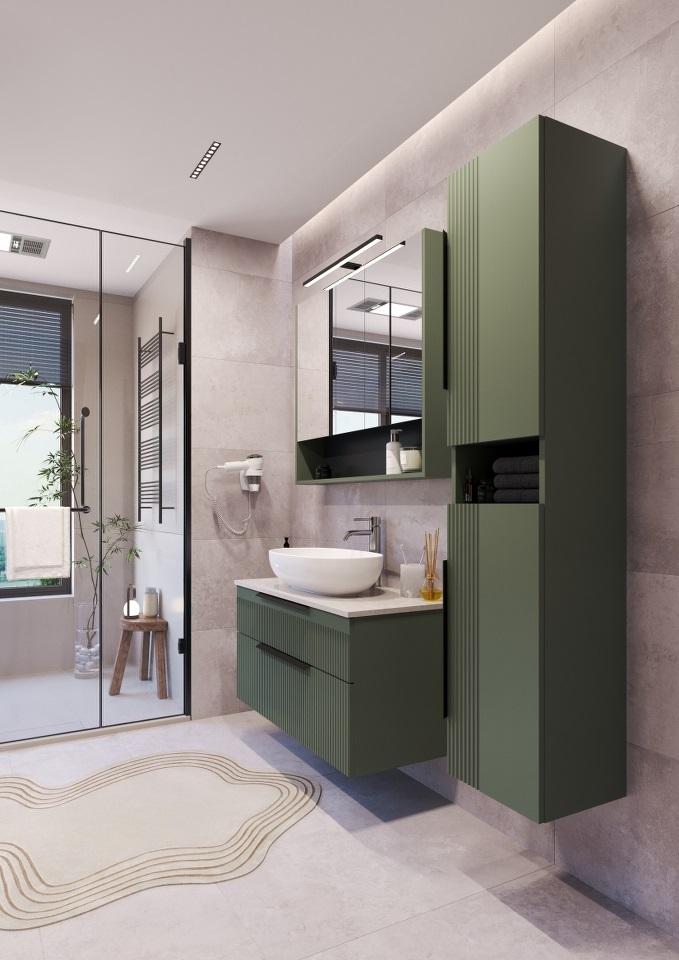 MIRIAD 100 donji kupaonski ormarić u zelenom mat dekoru s pločom Candela mramor donosi savršen spoj modernog dizajna i sofisticiranosti. Zeleni mat dekor unosi svježinu i smirenost u prostor, dok ploča Candela mramor pruža elegantnu i dugotrajniju površinu. Ovaj ormarić omogućuje efikasnu organizaciju kupaonice, nudeći prostran prostor za pohranu, dok istovremeno stvara luksuznu i profinjenu atmosferu.