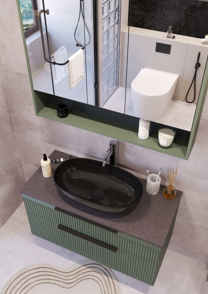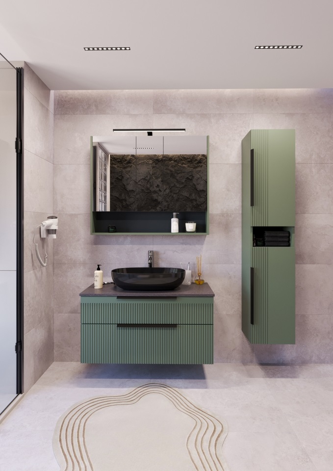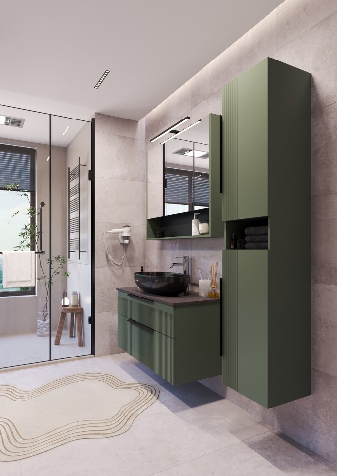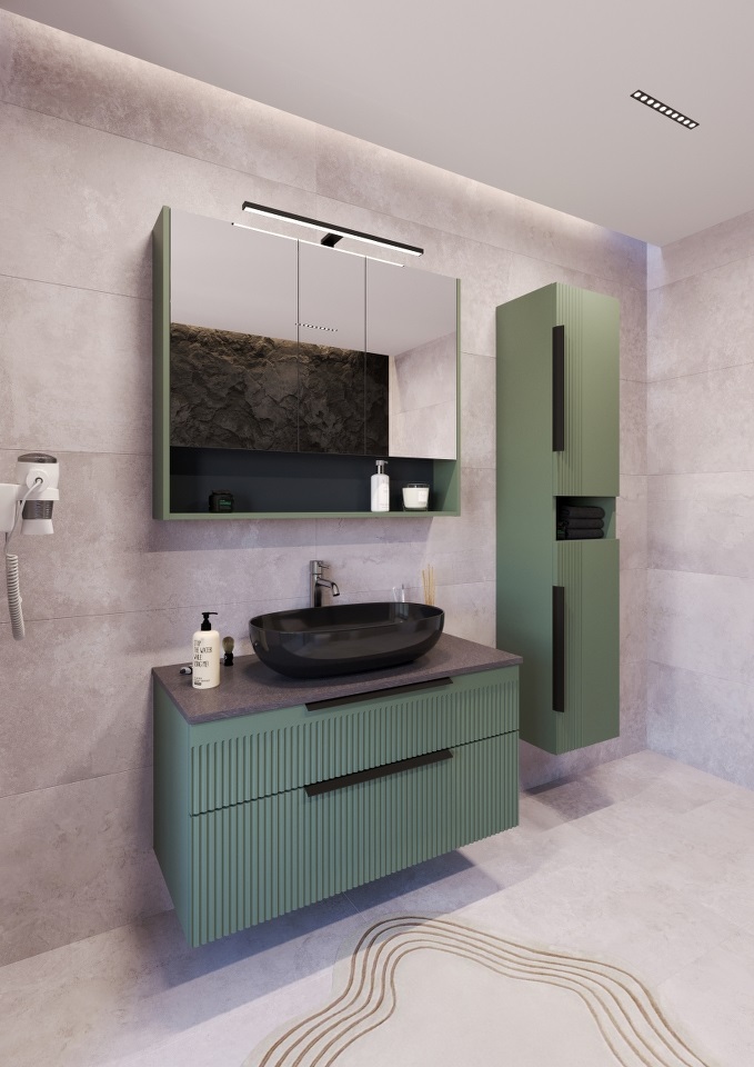 MIRIAD 100 donji kupaonski ormarić u zelenom mat dekoru s pločom Scivaro škriljevac donosi moderni dizajn u vašu kupaonicu, uz prirodni i sofisticirani ugođaj. Zeleni mat dekor pruža svježinu i smirenost prostoru, dok ploča Scivaro škriljevac dodaje čvrstoću i dugotrajan izgled. Ovaj ormarić nudi prostran i organiziran prostor za pohranu, savršeno usklađen s funkcionalnim i estetskim zahtjevima.