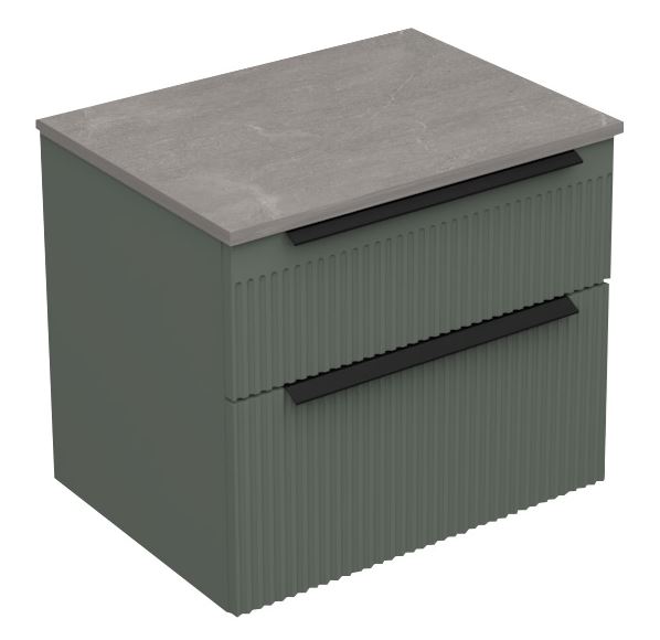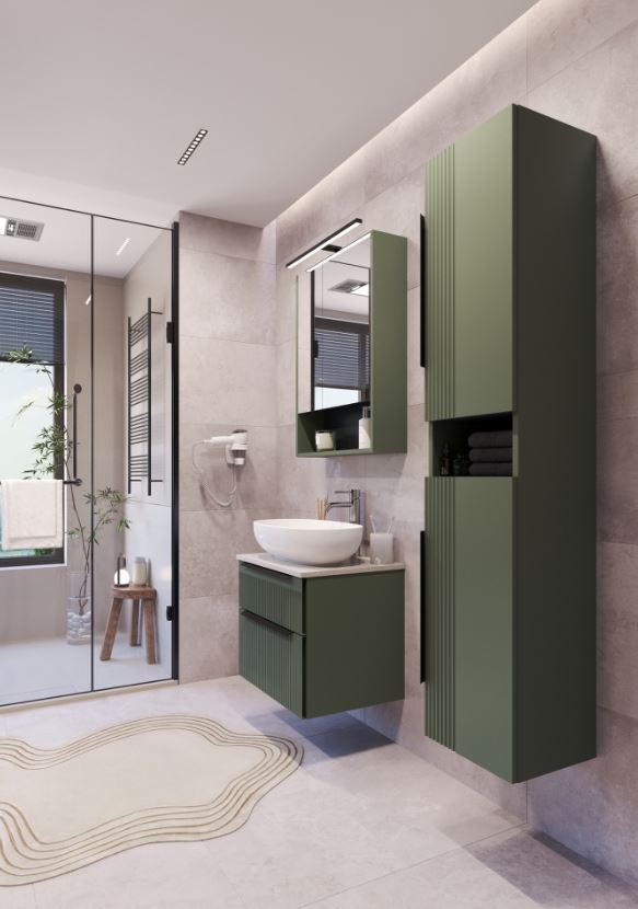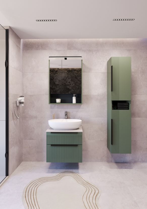 MIRIAD 60 donji kupaonski ormarić u zelenom mat dekoru s pločom Candela mramor donosi savršen spoj modernog dizajna i sofisticiranosti. Zeleni mat dekor unosi svježinu i smirenost u prostor, dok ploča Candela mramor pruža elegantnu i dugotrajniju površinu. Ovaj ormarić omogućuje efikasnu organizaciju kupaonice, nudeći prostran prostor za pohranu, dok istovremeno stvara luksuznu i profinjenu atmosferu.