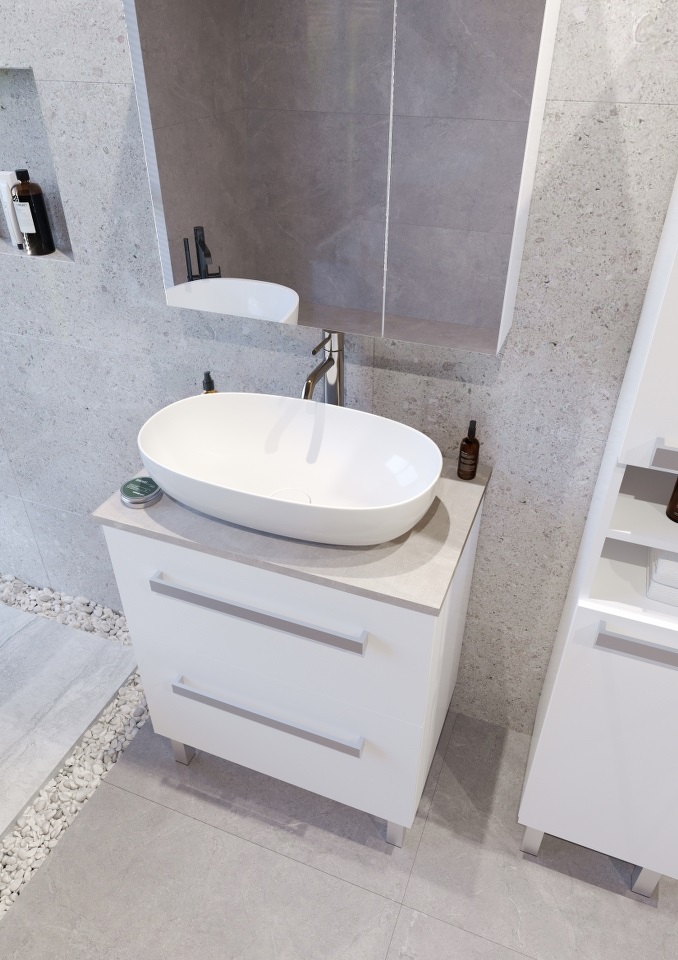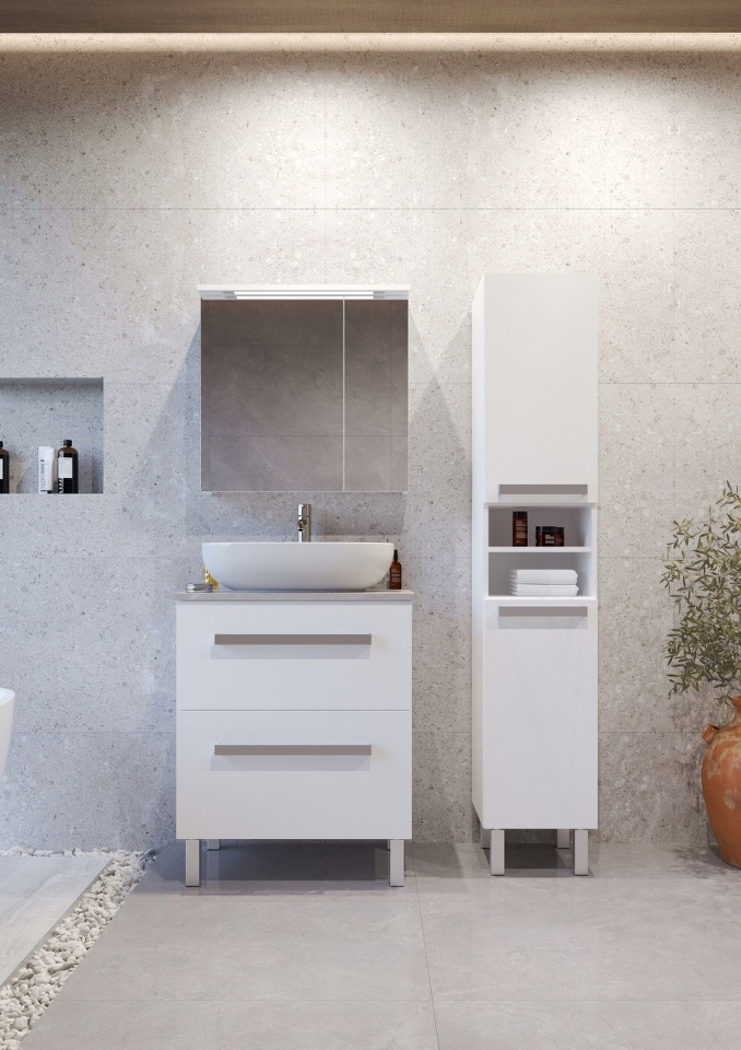 SARA 70 donji kupaonski ormarić u bijelom sjaju s pločom Candela mramor pruža luksuzan i moderni izgled. Ploča Candela mramor u kombinaciji s bijelim sjajem unosi svježinu i eleganciju u vaš prostor, stvarajući funkcionalnu i sofisticiranu kupaonicu.