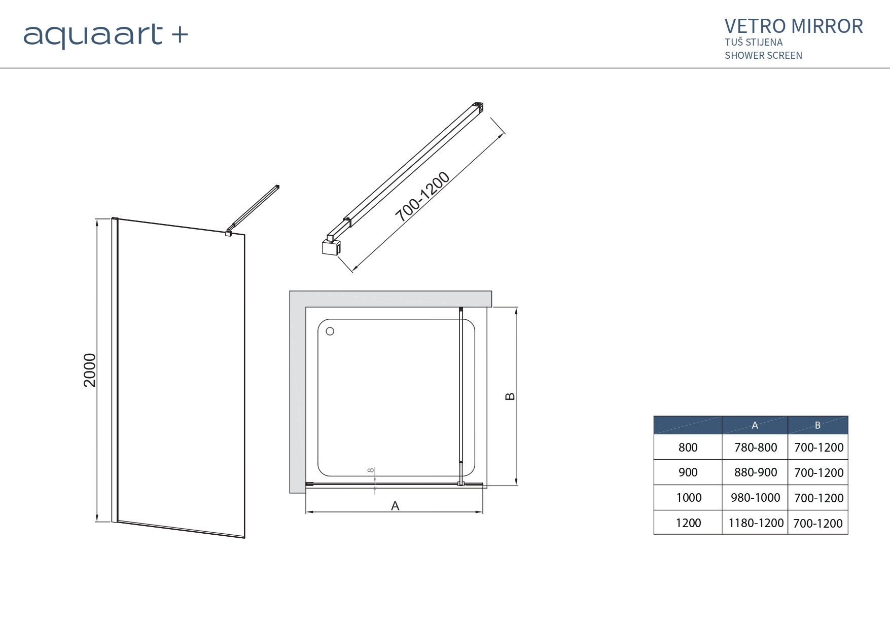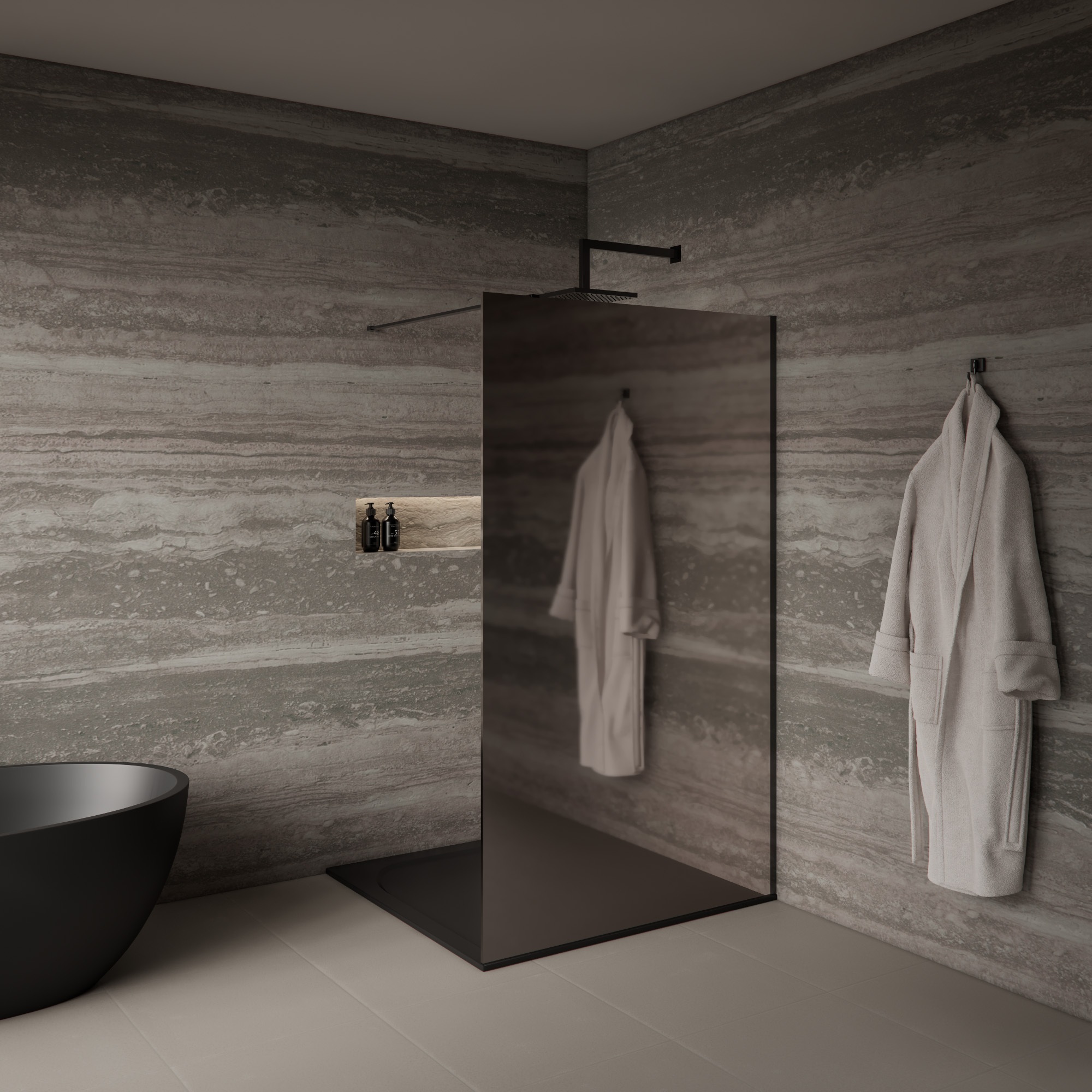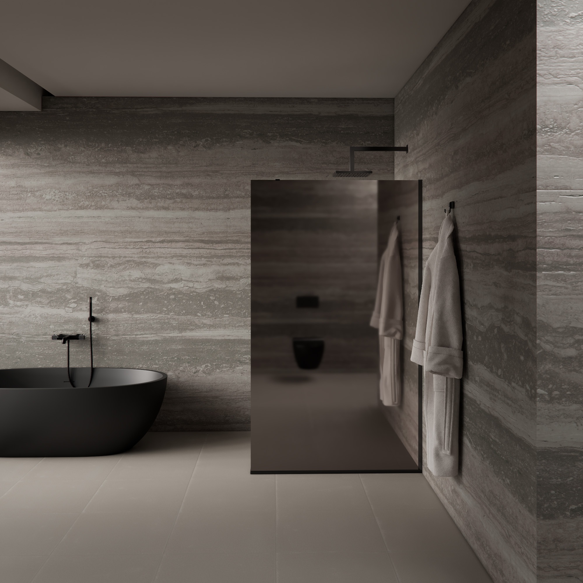 Tuš stijena od zrcalnog toniranog kaljenog stakla debljine 8 mm s aluminijskim zidnim profilima unosi reflektirajući efekt koji vizualno proširuje prostor, dok stabilizacijska šipka duljine 120 cm osigurava sigurnu i jednostavnu montažu. Moguća je ugradnja na tuš kadu ili direktno na pod.