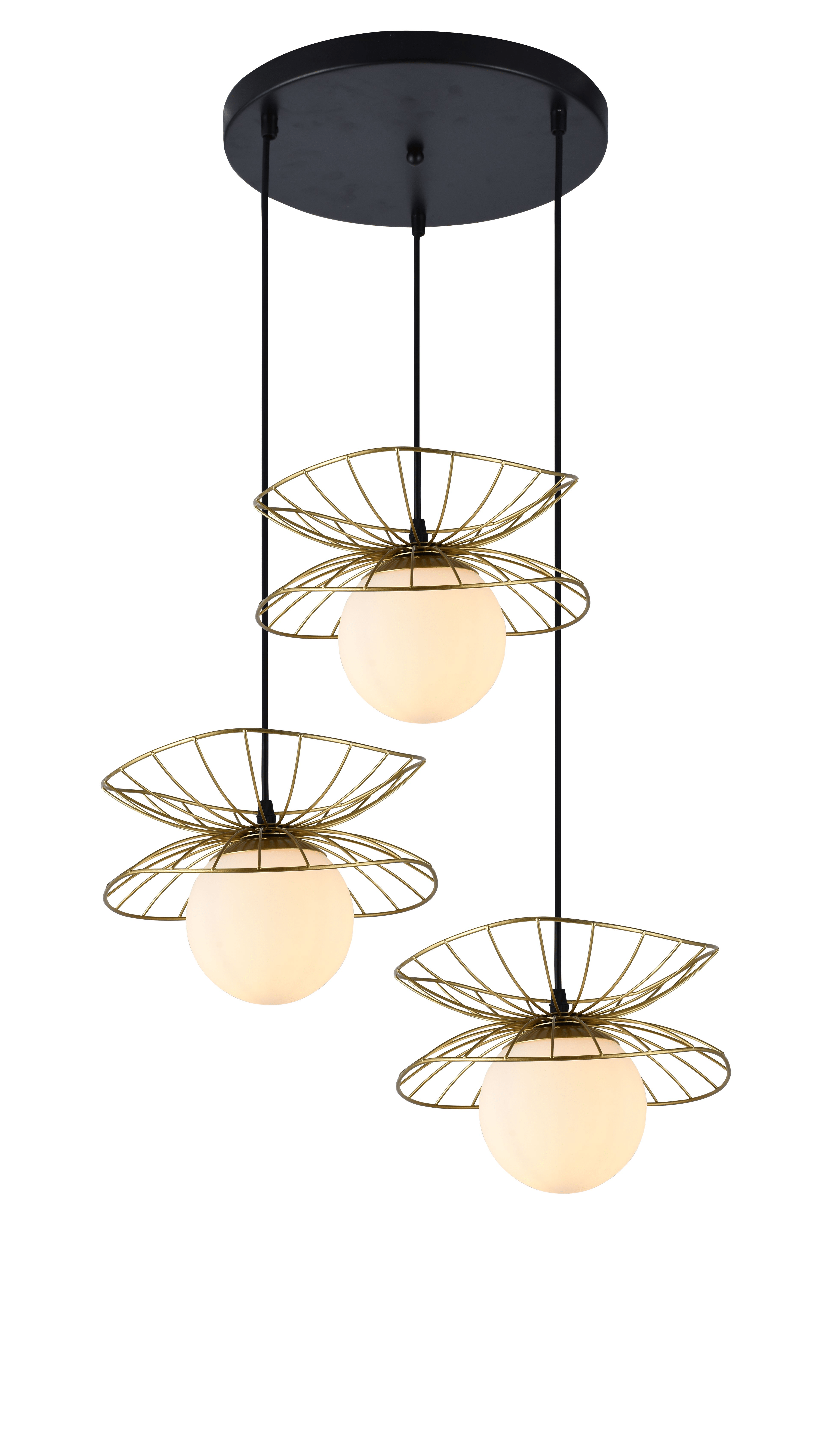 Moderna viseća svjetiljka iz serije Zoe. Crni kabel te metalno mat zlatno sjenilo i tri bijele staklene kugle.