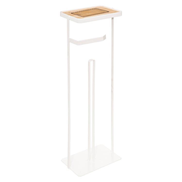 Bijeli samostojeći držač toaletnog papira koji pruža i prostor za odlaganje mobitela. Kombinirajte ovaj držač WC papira s držačem WC četke za elegantan izgled u svom WC-u ili kupaonici. Držač je izrađen od metala i drvene telefonske ploče. Držač ima mjesta za do 3 role papira. Dimenzija: 18x12x59,2 cm.