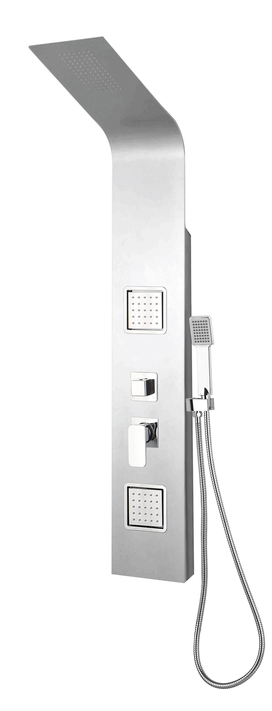 Tuš panel 140×22 cm izrađen od visokokvalitetnog PVC-a u elegantnoj srebrnoj boji. Opremljen gornjim tušem s 50 mlaznica, leđnom masažom s 2 seta mlaznica, ručnim tušem s 1,5 m crijevom, držačem ručnog tuša i kvalitetnom miješalicom. Unesite luksuz i udobnost u svoju kupaonicu s ovim modernim i funkcionalnim tuš panelom.