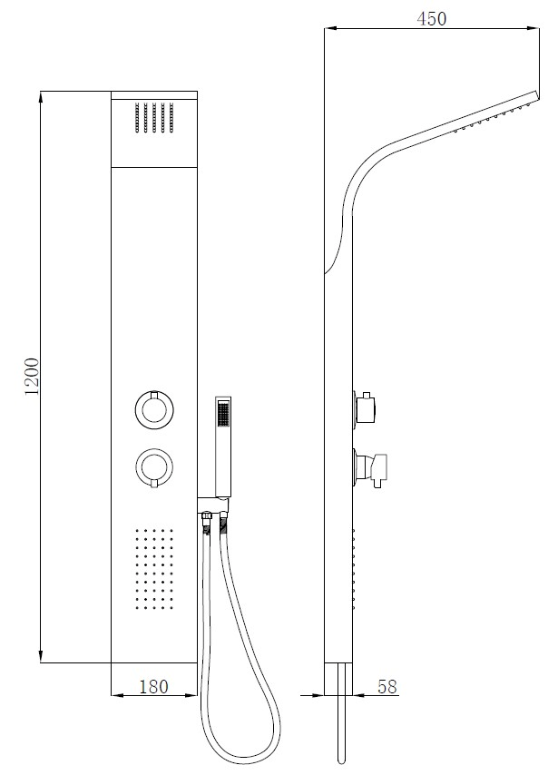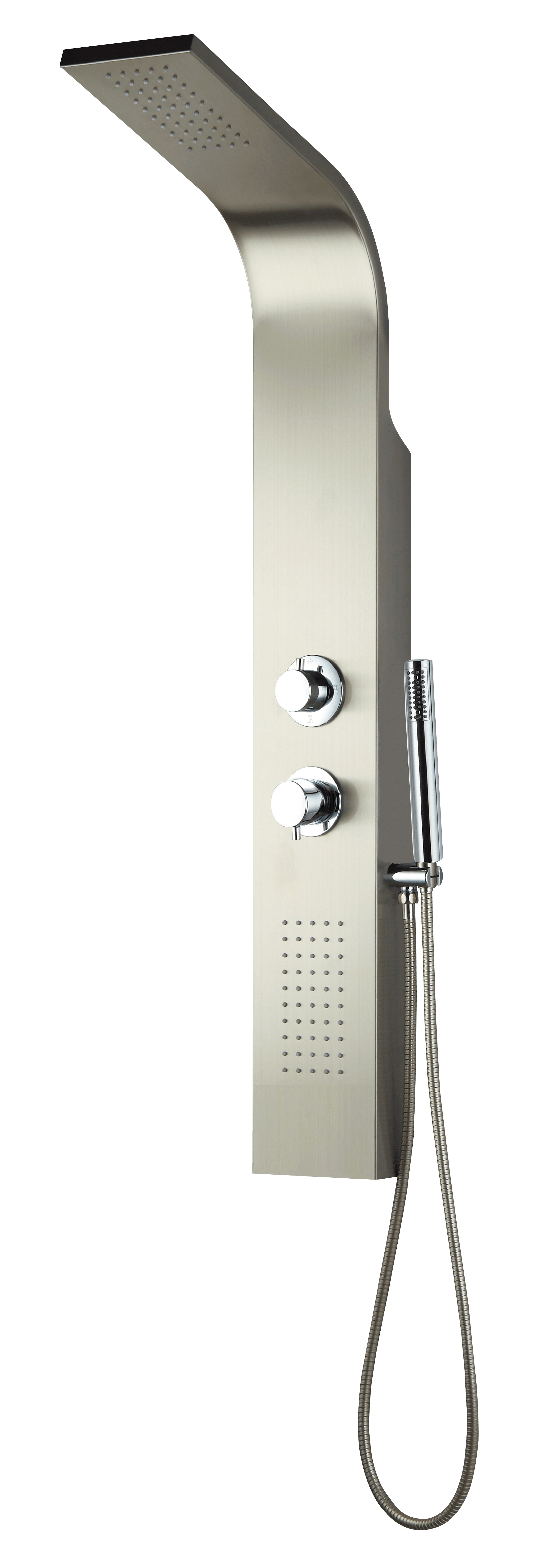 Tuš panel 120×18 cm izrađen od nehrđajućeg čelika. Opremljen gornjim tušem s 50 mlaznica, leđnom masažom s 1 setom mlaznica, ručnim tušem s 1,5 m crijevom, držačem ručnog tuša i kvalitetnom miješalicom. Unesite luksuz i udobnost u svoju kupaonicu s ovim modernim i funkcionalnim tuš panelom.