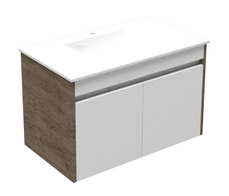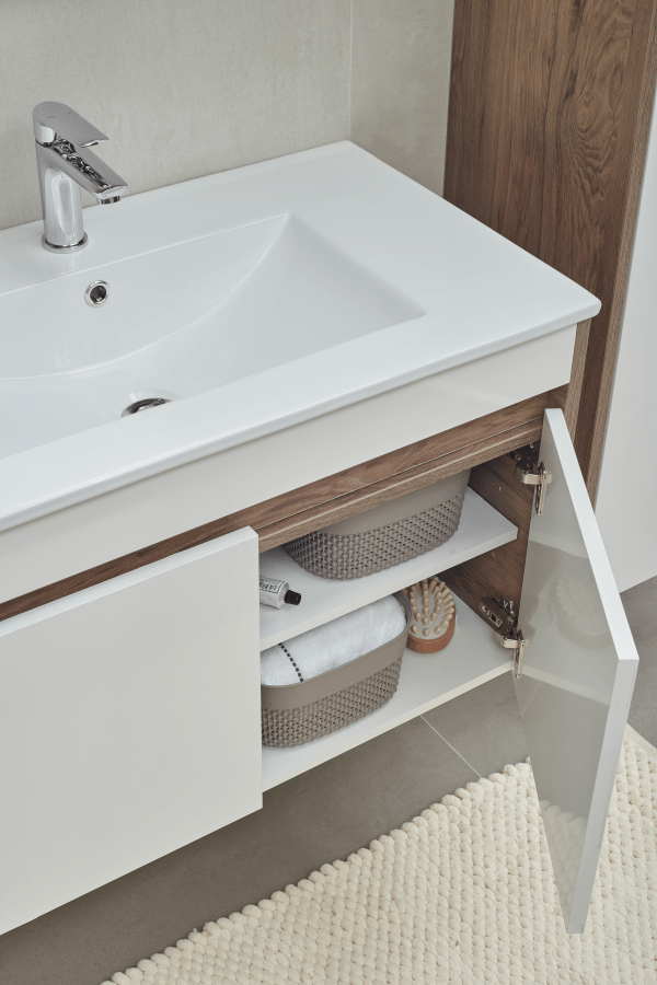 Donji ormarić kupaonskog kompleta IVA u dekoru darkwood. Fronte MDF obložen PVC folijom u dekoru bijeli sjaj, a bočnice i maska od iverala u dekoru darkwood. Ugradbeni keramički umivaonik. Prodaje se bez sifona. Hrvatska proizvodnja.