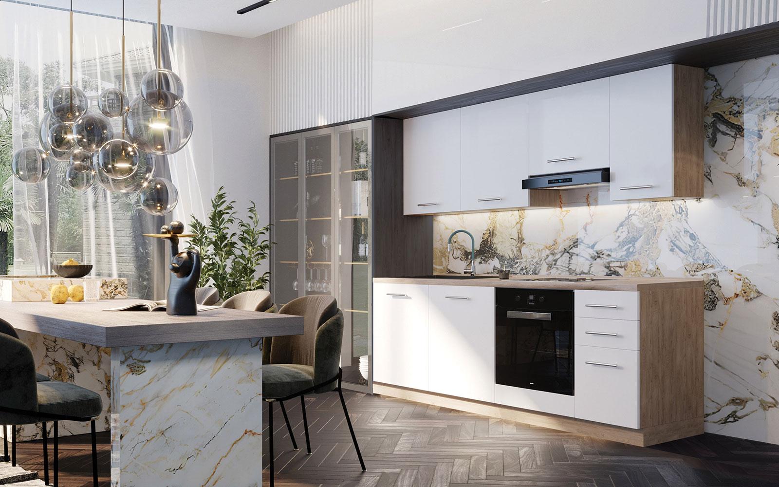 fronte: bijela sjaj; korpus: hrast, r. ploča: hrast