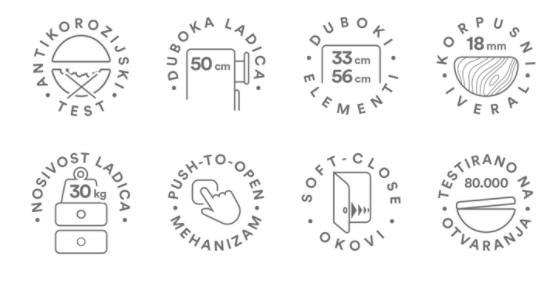 • korpusi, kao i police izrađeni od troslojne oplemenjene iverice debljine 18mm