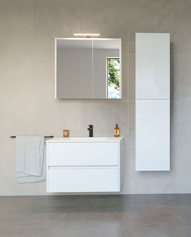 Kupaonski ormarić s ogledalom Merry u MDF visokosjajnoj bijeloj boji nudi praktično i organizirano rješenje za svakodnevnu upotrebu u kupaonici. Ormarić je opremljen prekidačem i utičnicom za praktično korištenje električnih uređaja, dok integrirana LED rasvjeta za ogledalo pruža jasno i ravnomjerno osvjetljenje ispred ogledala. LED svjetlo snage 4,4 W i temperature boje od 4000 K pruža prirodno svjetlo koje poboljšava vidljivost tijekom svakodnevnih rutina. Izrađeno od kromiranog ABS materijala, svjetlo je otporno na vlagu i jednostavno za održavanje. Čiste linije, ogledalo pune širine i sjajne prednje strane omogućuju mu da se lako uklopi u različite stilove kupaonica, dok unutrašnjost pruža praktično pohranjivanje kozmetike i kupaonskih potrepština.