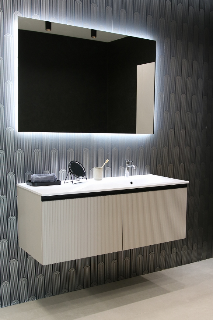 Donji ormarić kupaonskog kompleta Mirage u dekoru kašmir s crnom ručkicom. Opremljen je s tri ladice što nudi puno mjesta za odlaganje. Unutarnja skrivena ladica se nježno otvara i zatvara laganim pritiskom. Umivaonik od lijevanog mramora se prodaje odvojeno – šifra artikla 002568.