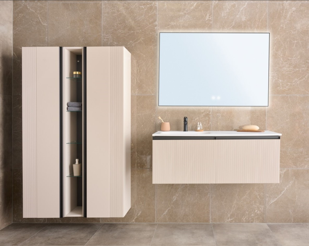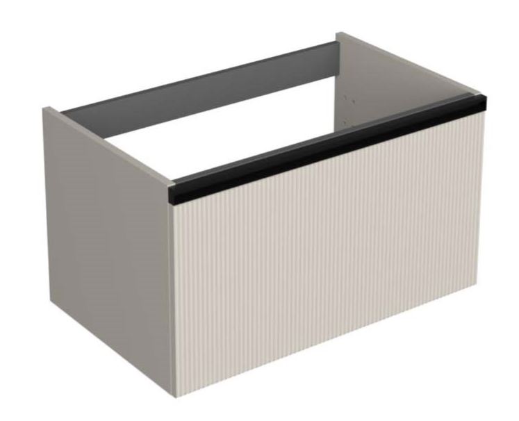Donji ormarić kupaonskog kompleta Mirage u dekoru kašmir s crnom ručkicom opremljen jednom dubokom ladicom. Sofisticirani dizajn skladno se stapa sa suptilnom formom umivaonika izrađenog od lijevanog mramora. Umivaonik se prodaje odvojeno – šifra artikla 002576.