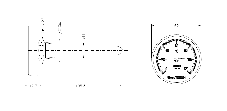 FERRO TERMOMETAR BIMETALNI fi 100,0-120°C, R1/2″”, aksijal tip