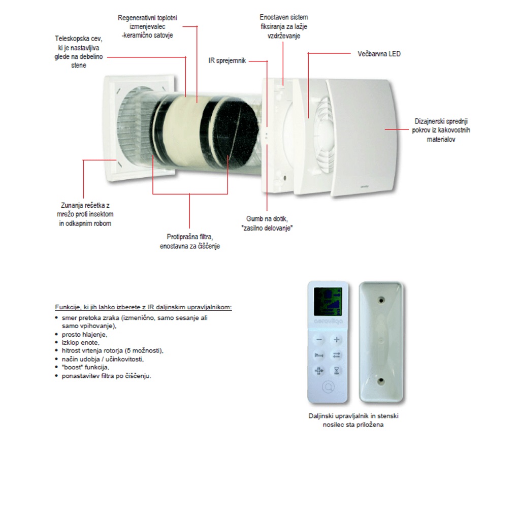 Decentralizirana mehanička ventilacijska jedinica s izmjeničnim protokom i jezgrom za povrat topline (tip „push-pull“): izuzetno niska potrošnja energije. Za ugradnju u jednu prostoriju poput dnevnog boravka i spavaće sobe: za bolje uravnoteženje protoka obično se koriste dvije jedinice u paralelnom radu, sa suprotnim i sinkroniziranim protokom.