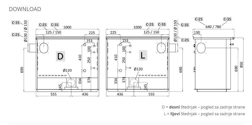 Odvod dimnih plinova: ? 130 mm, lijevo ili desno (bočno i otraga), prema narudžbi može i gore