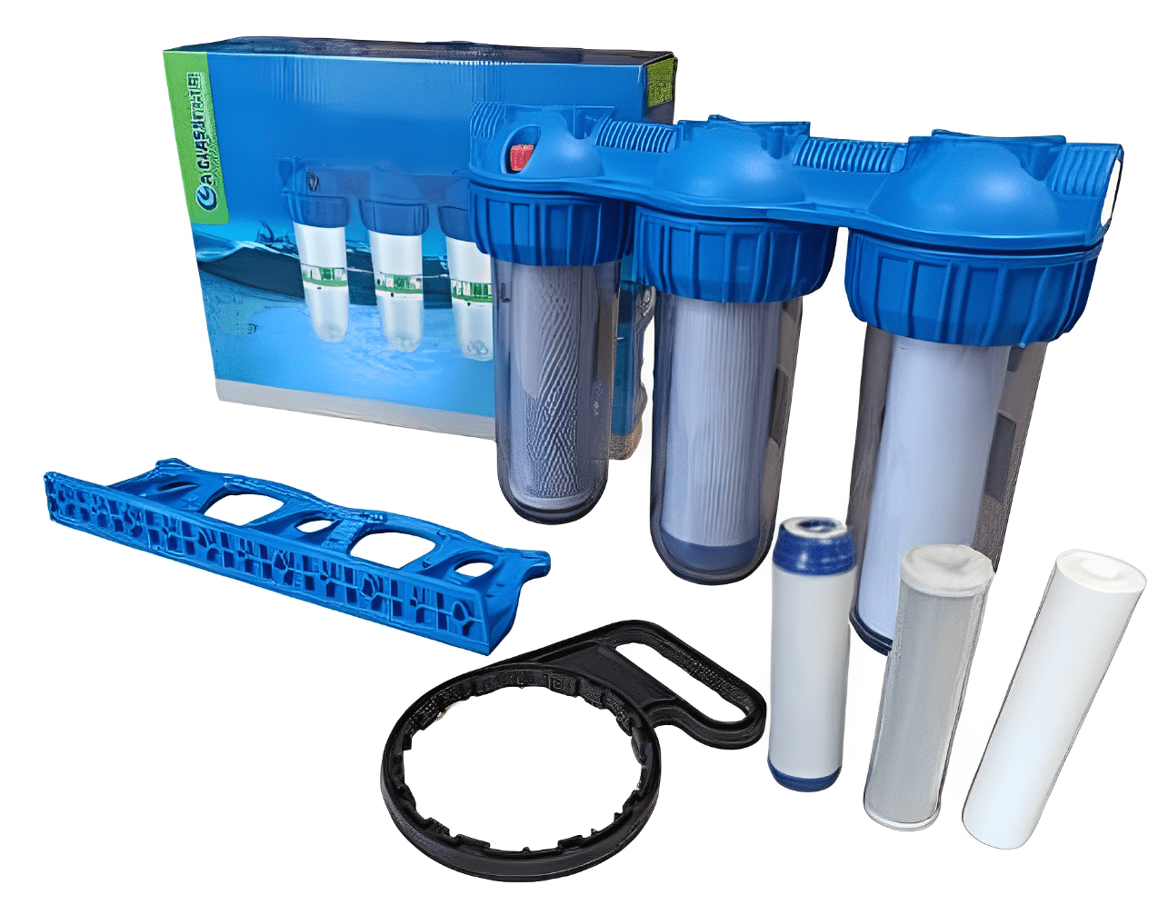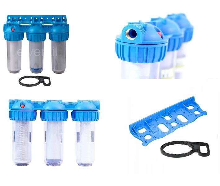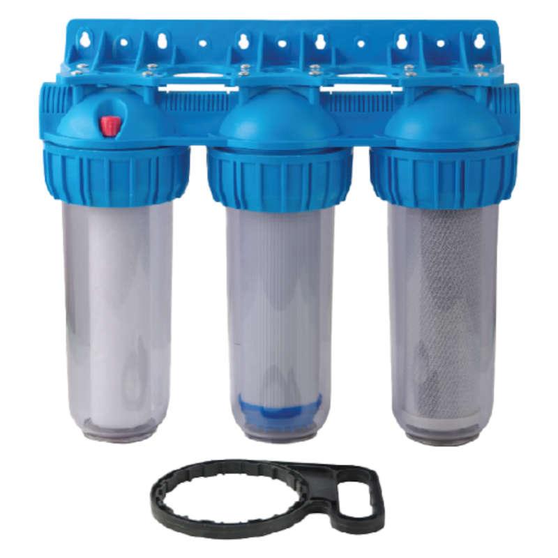 Trostruko kućište filtera s tri uloška (filtracija vode u tri stupnja). Svaki naredni filter karakterizira veća razina filtracije. Filteri su namijenjeni za pročišćavanje i obradu vode u stanovima i manjim kućama. Kućište izrađeno od izdržljivih materijala (ojačani polipropilen) koji jamči dugi niz godina besprijekornog rada.