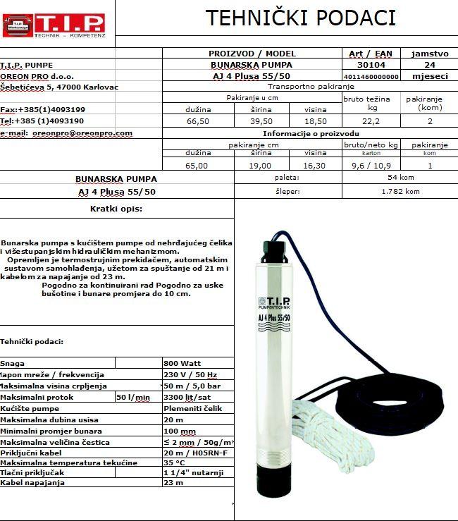Bunarska pumpa s kućištem pumpe od nehrđajućeg čelika i višestupanjskim hidrauličkim mehanizmom. Opremljen je termostrujnim prekidačem, automatskim sustavom samohlađenja, užetom za spuštanje od 21 m i kabelom za napajanje od 23 m. Pogodno za kontinuirani rad Pogodno za uske bušotine i bunare promjera do 10 cm.