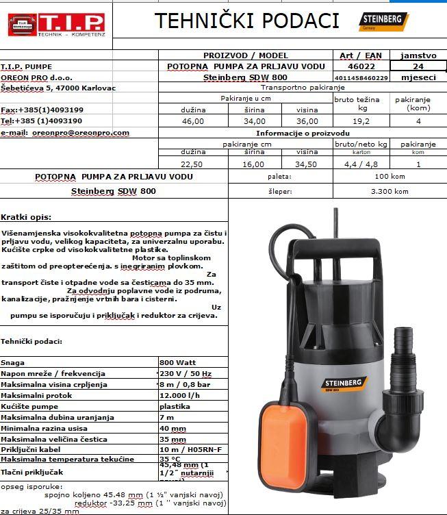 Višenamjenska visokokvalitetna potopna pumpa za čistu i prljavu vodu, velikog kapaciteta, za univerzalnu uporabu. Kućište crpke od visokokvalitetne plastike. Motor sa toplinskom zaštitom od preopterećenja. s inegriranim plovkom. Za transport čiste i otpadne vode sa česticama do 35 mm. Za odvodnju poplavne vode iz podruma, kanalizacije, pražnjenje vrtnih bara i cisterni. Uz pumpu se isporučuju i priključak i reduktor za crijeva.