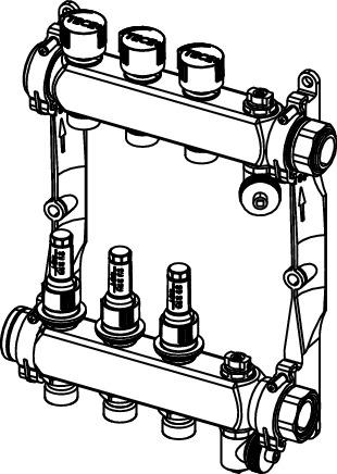 Razdjelnik od plemenitog čelika, nosač razdjelnika s velikim volumenom komore, površina polirana, zvučno izolirani plastični držači s funkcijom brze ugradnje, sa spojnicom 1″ s ravnim brtvilom. Integrirani povratni ventili s dvostrukom O-prstenastom brtvom na podizaču ventila, tanjuru ventila s O-prstenastom brtvom za trajno sigurno zatvaranje grijaćih krugova, mjerač protoka s mogućnošću zatvaranja 0,5-4 litara s blokadom sukl. normi EN 1264-4.