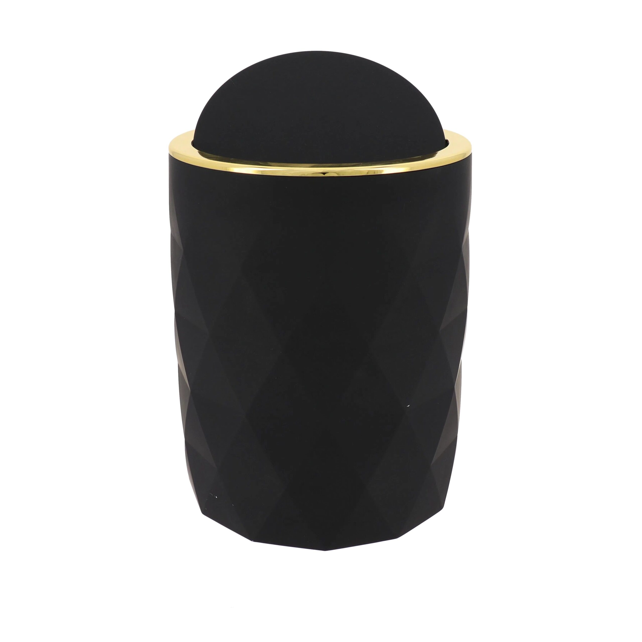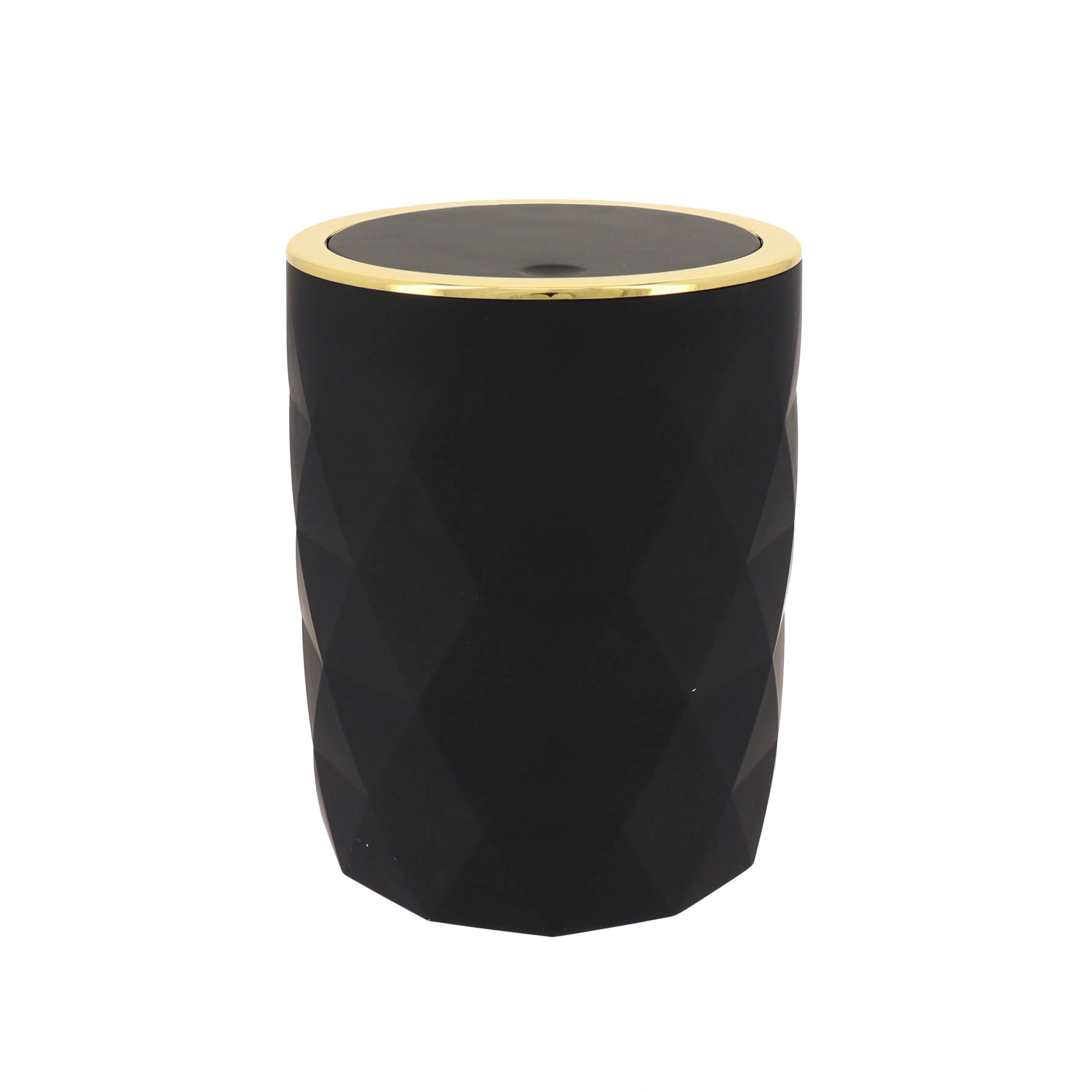 Kanta za smeće od 6 litara spoj je funkcionalnosti i sofisticiranog dizajna koji unosi dozu elegancije u svaki prostor. Crna mat površina s teksturom ispupčenih i udubljenih rombova daje joj moderan i luksuzan izgled, dok zlatni obrub oko poklopca dodaje profinjeni završni detalj. Izrađena od ABS plastike i gume, ova kanta osigurava čvrstoću i dugotrajnost, a kompaktne dimenzije (19×24,5 cm) omogućuju jednostavno postavljanje u kupaonici, uredu ili bilo kojem manjem prostoru. Poklopac sprječava širenje neugodnih mirisa, dok glatka površina omogućuje lako čišćenje i održavanje.