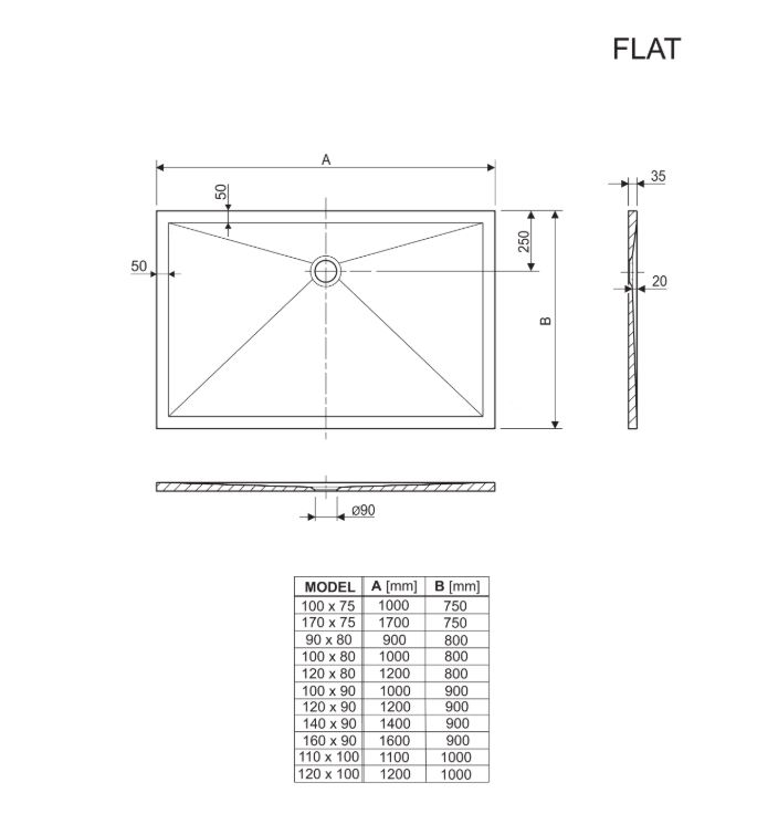 Flat je izrazito plitka tuš kada izrađena od lijevanog mramora i prvenstveno je namijenjena ugradnji u razinu poda. Materijal od kojeg je izrađena daje joj nenadmašnu čvrstoću i sjajnu površinu koja se lako čisti i održava. Tuš kada je dostupna u bijeloj, crnoj i sivoj boji u sjajnom efektu.
