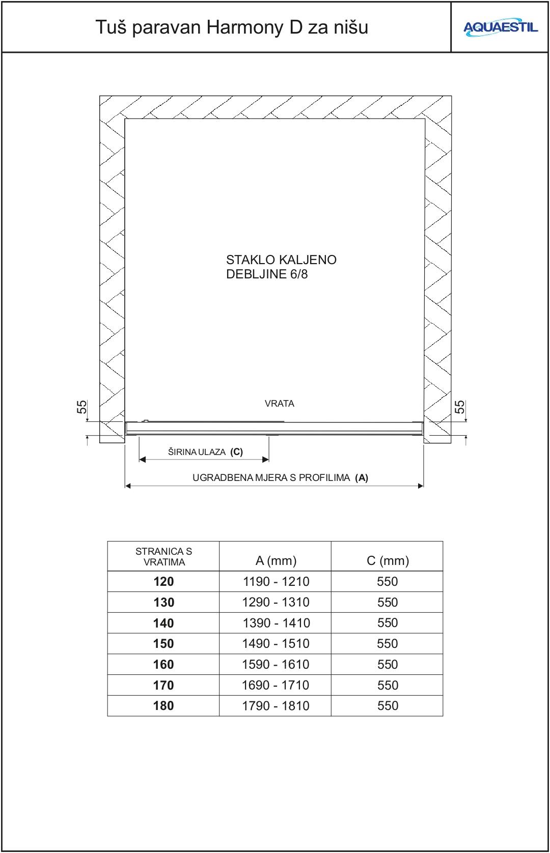 Harmony D za nišu elegantan je klizni paravan standardne visine 210 cm, opremljen skrivenim sistemom mekog zatvaranja i sustavom za otklanjanje vrata radi lakšeg čišćenja i održavanja. Dizajn paravana Harmony odlikuje se naprednim značajkama i minimalnom uporabom profila. Varijanta za nišu sastoji se od stranice s fiksnim dijelom i kliznim vratima.