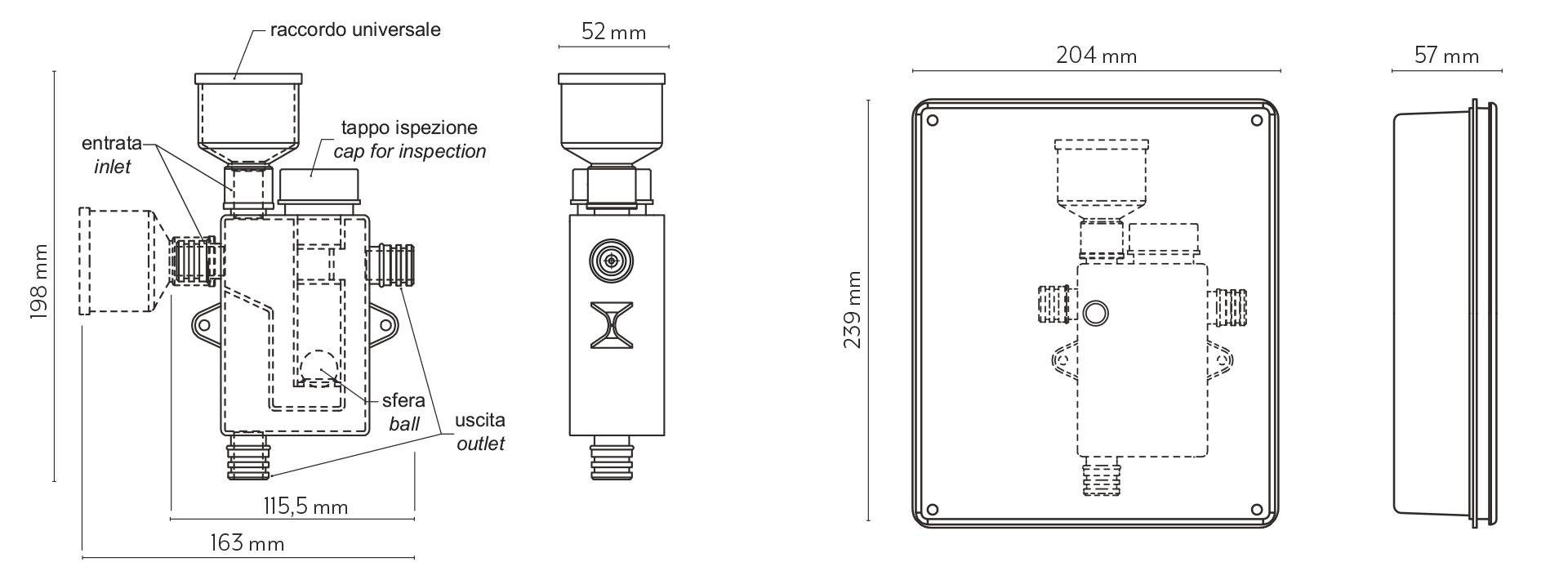 Tijelo sifona opremljeno s dva horizontalna ulaza i izlaza, što omogućuje ugradnju s desne ili lijeve strane, bez obzira na položaj