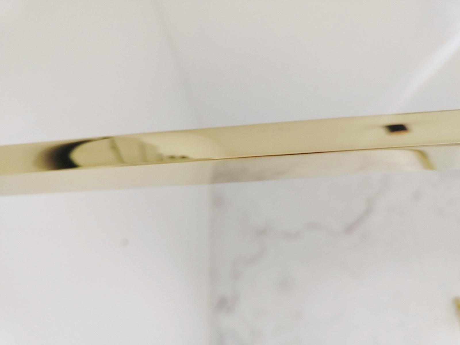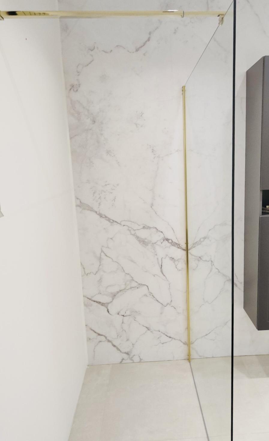 Staklena tuš stijena s 8 mm kaljenim transparentnim staklom i zlatnim aluminijskim profilom. Moguće je prilagoditi dužinu noseće šipke staklene stijene od 700 do 1200 mm. Staklo sprječava prskanje vode po podu i stvara dojam prostranosti pa je idealno rješenje za vizualno povećanje kupaonice.