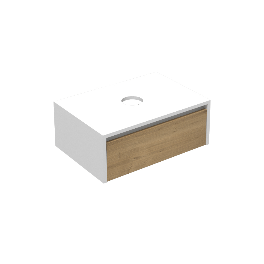 Donji kupaonski ormarić serije Vital. Korpus MDF bijeli sjaj, a fronta iveral u dekoru hrast authentic. Proizvedeno u Hrvatsko